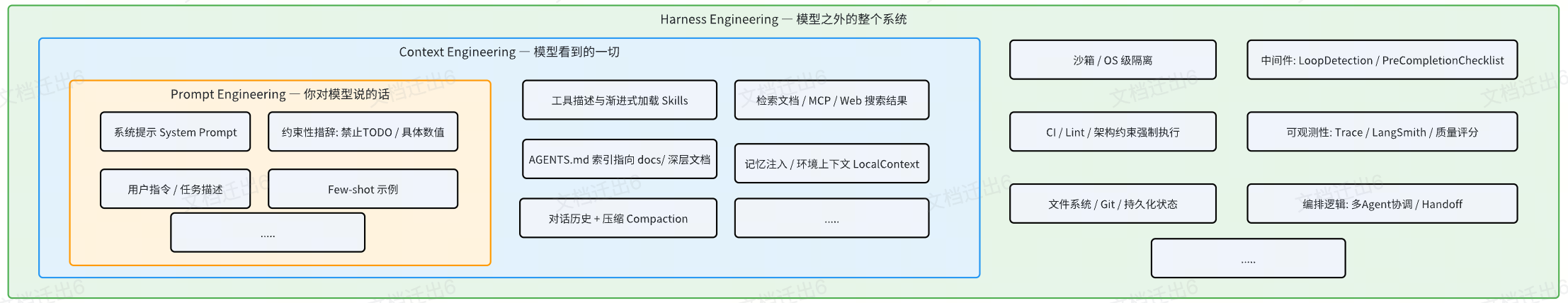 | 包含什么 | 系统提示、用户指令、Few-shot 示例 | Prompt + 工具描述 + 检索文档 + 对话历史 + 记忆 + 压缩策略 | Context + 沙箱 + CI + 中间件 + 可观测性 + 编排逻辑 + 文件系统 |