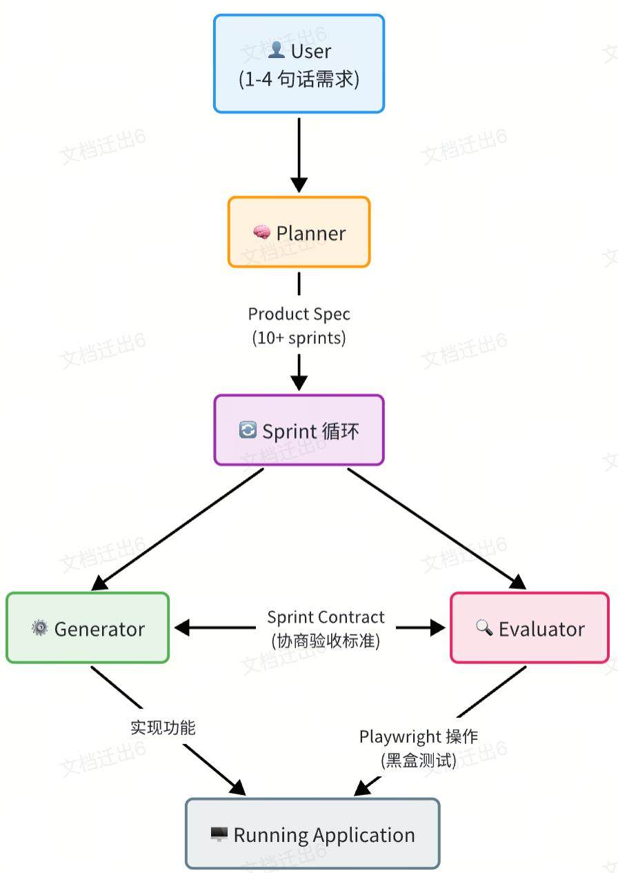 Anthropic 的解法是一个受 GAN(生成对抗网络)启发的三角色架构,核心思路是将生成与评估分离,通过独立的角色和信息隔离来解决自评偏差和方向漂移: