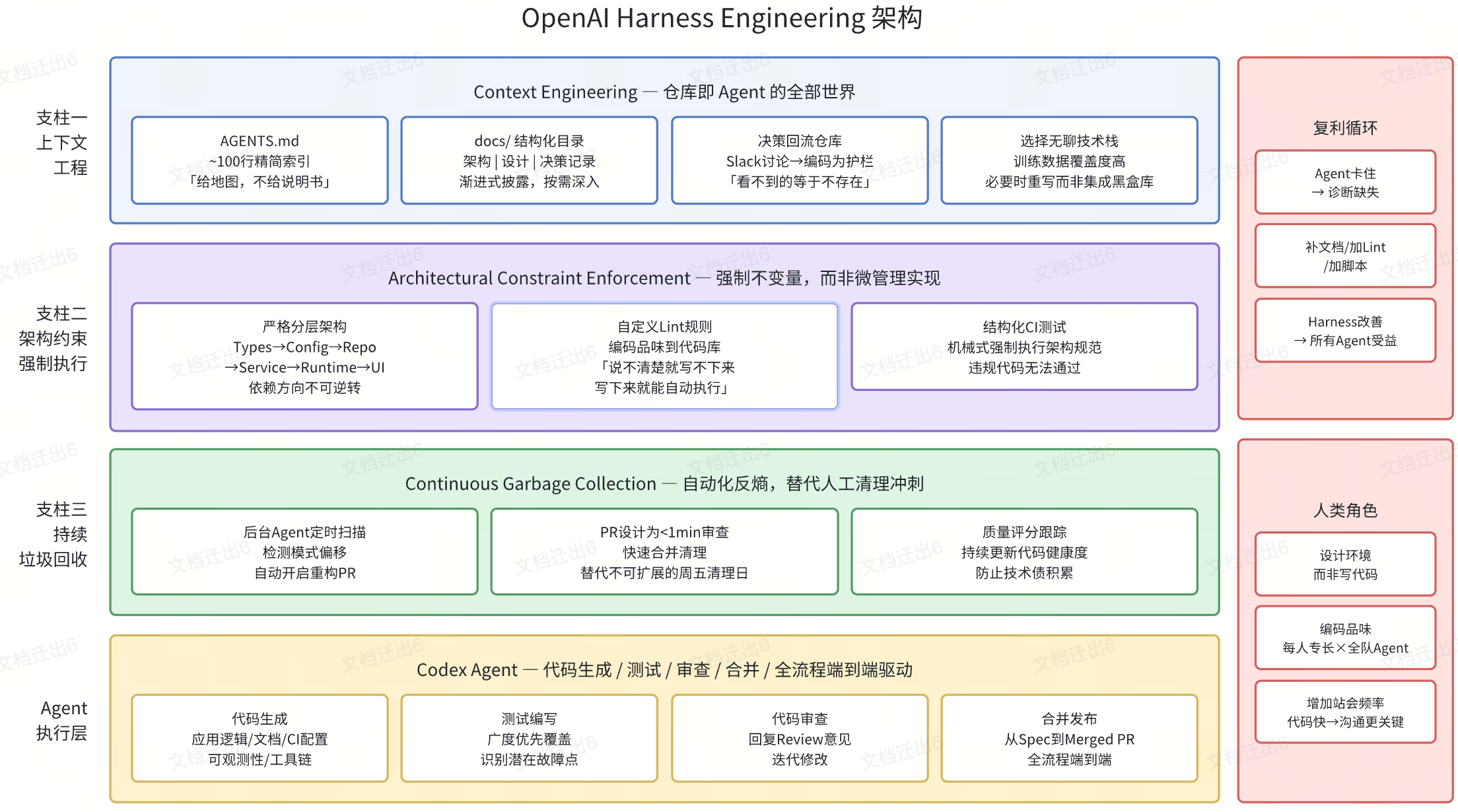 - 复利循环:Agent 卡住 → 人类诊断缺失(缺文档?缺约束?缺工具?)→ 补充到 Harness → 所有 Agent 受益。每位工程师编码的专长都乘以整个团队的 Agent 舰队效能