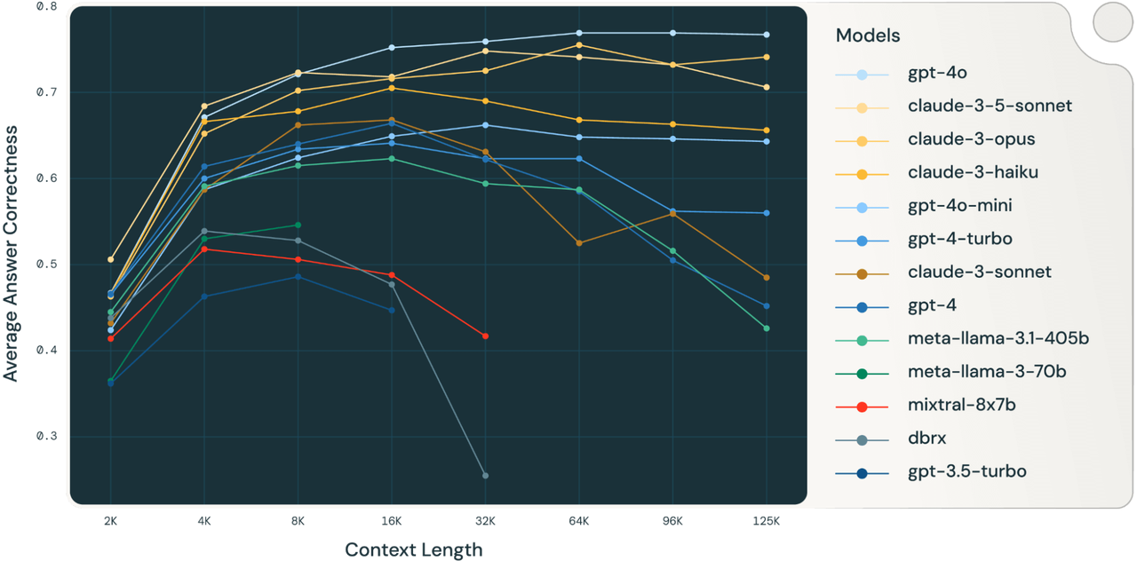 其次,上下文越长,性能衰退越明显。 Databricks 团队进行了超过 2000 次系统性实验,结果显示,随着上下文长度的增加,模型的信息提取能力显著下降。例如,claude-3-sonnet 模型在 16K token 上下文长度下的准确率为 0.668,而在 125K token 下则降至 0.485,降幅超过 27% 。